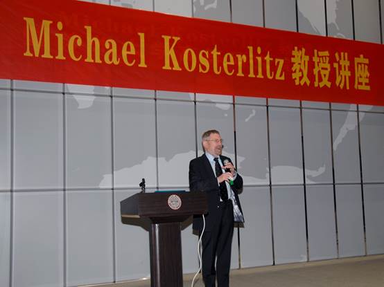 授聘仪式前,科斯特利茨教授为我校师生带来了题为《Topological Order and Defects, and Phase Transitions in Two Dimension》学术报告。在报告中,科斯特利茨教授详细介绍了拓扑理论的历史发展过程,介绍了他发现landau理论的不足及他的创新。讲座中,科斯特利茨教授与我校师生互动,基于自己的实验过程深入浅出地阐述了超导现象在低温及高温下的拓扑相变机制。他谦逊地表示,会对自己的研究体系进一步检验以不断完善和补充。当问及科斯特利茨教授对国内学界的研究者们有何建议时,他鼓励有志于此的青年学者在该领域内坚定地走下去,并且从中收获乐趣。