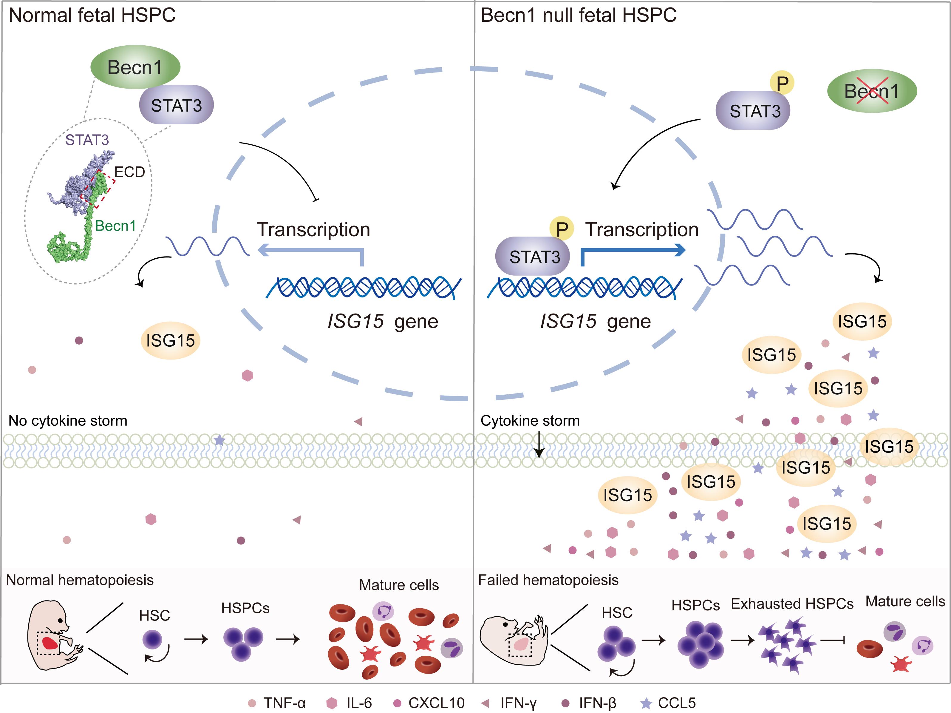 该研究成果拓展了以往以为只有免疫细胞才能产生细胞因子风暴的认知。因为该研究发现胚胎发育过程中造血细胞也能发生细胞因子风暴,一旦Beclin1缺失,即可促发ISG15介导的细胞因子风暴而导致造血细胞死亡、造血失败,进而导致胚胎死亡。领域内之前还认为,ISG15基因必须通过干扰素信号途径作用才能被激活,且必须由蛋白激酶JAK1、TYK2和信号转导及转录激活因子STAT1和STAT2参与,才能激活ISG15基因及其介导的下游炎症反应。该研究则发现,ISG15尽管之前被命名为干扰素激活基因,但ISG15基因在胚胎造血系统中的激活并不一定需要干扰素途径的激活,只要Beclin1失去对STAT3的结合能力或失去对STAT3的蛋白修饰管控,ISG15即可发生表达,继而诱发细胞因子风暴,而功能挽救实验可以逆转这一风险,由此揭示了胚胎中Beclin1管控ISG15“误爆”的分子途径。