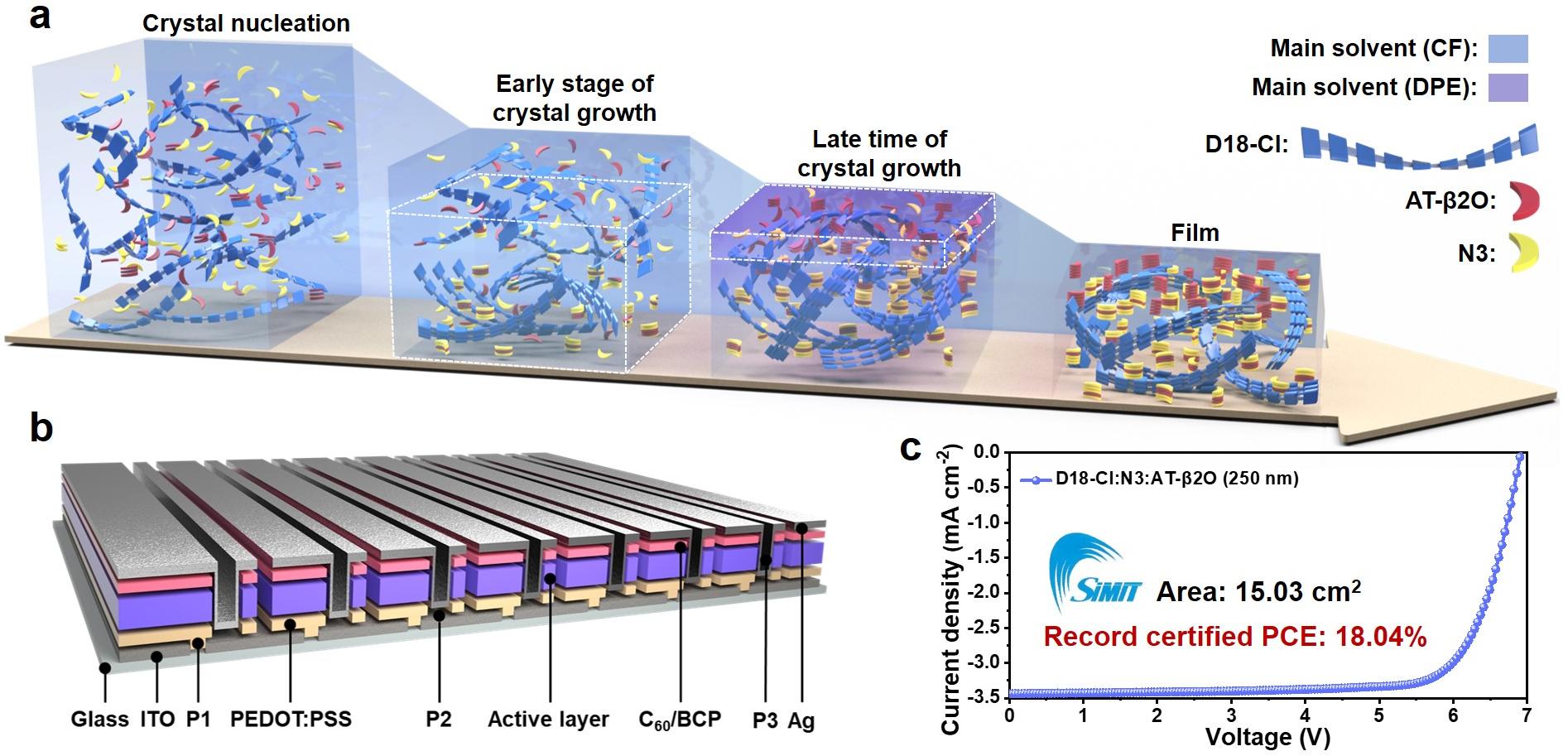 该论文解决了有机太阳能电池效率(PCE)随活性层膜厚增加急剧衰减的问题,获得纪录认证效率的小面积单节(PCE = 20.43%,0.062 cm2)和大面积模组(PCE = 18.04%,15.03 cm2)有机太阳能电池。论文以苏州大学为第一及唯一通讯署名单位发表。第一作者为我校博士后陈海阳,通讯作者为李耀文。