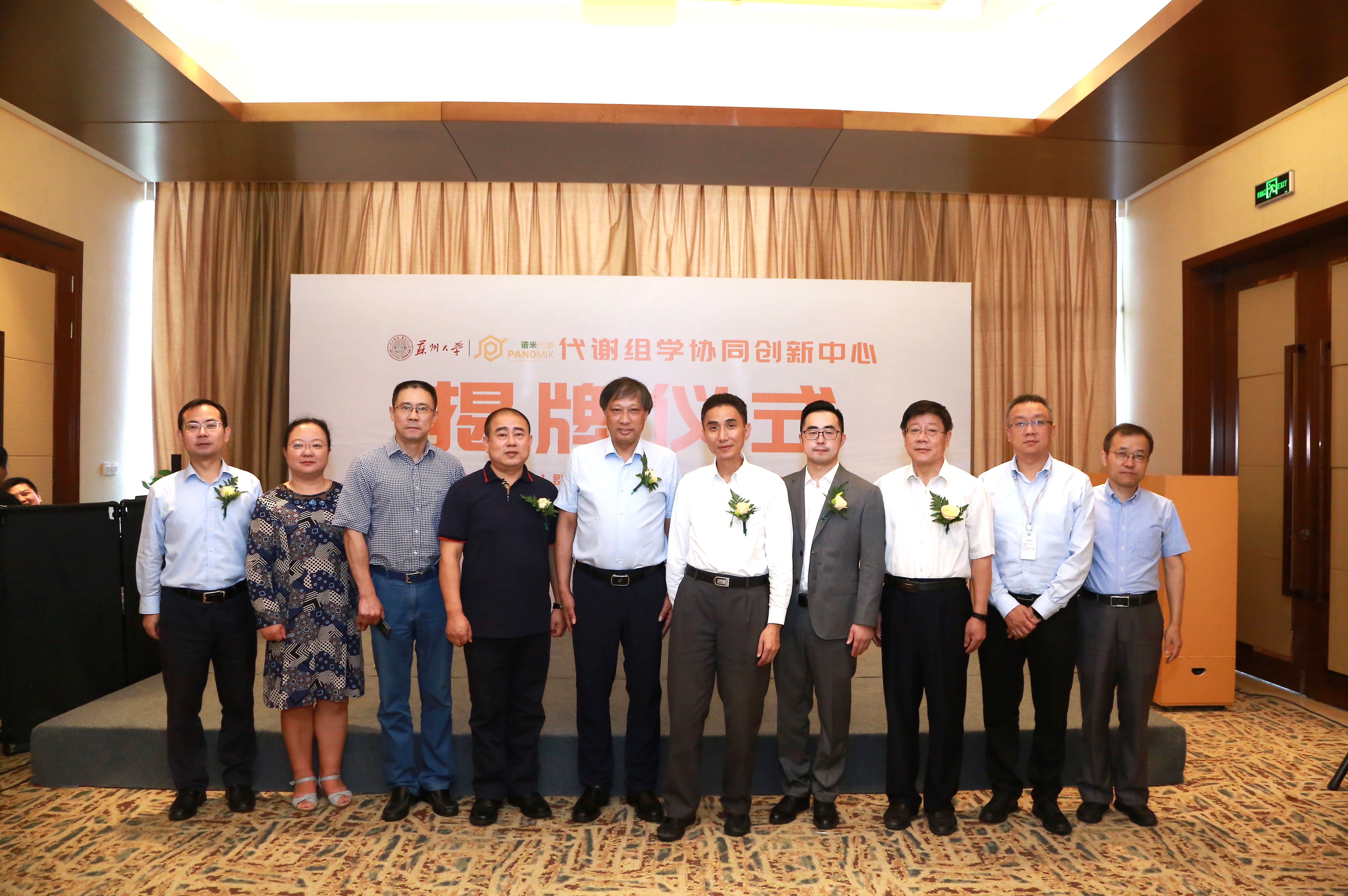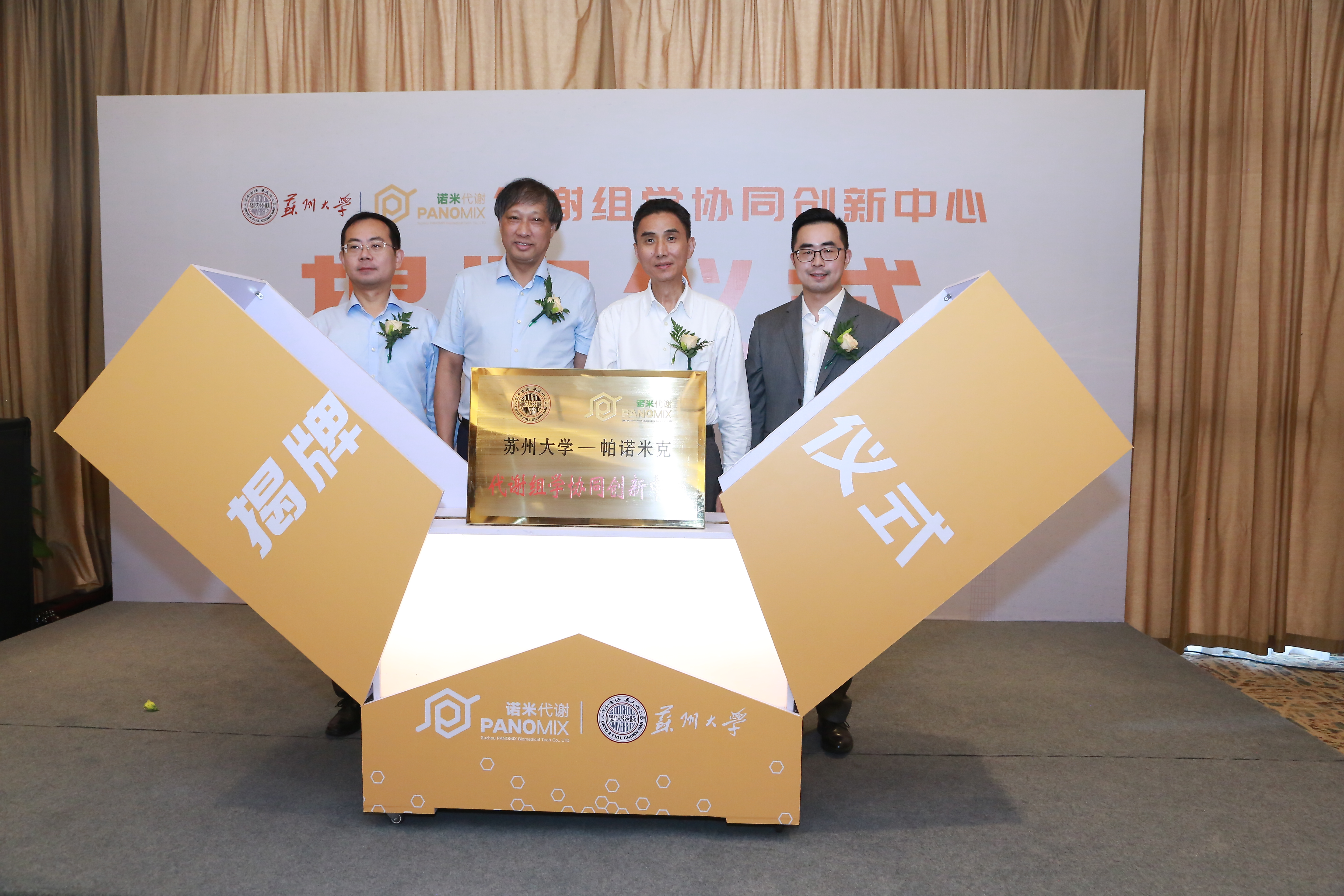 在与会领导、嘉宾的共同见证下,邹学海、许文清、任建洪和包杨欢共同为“苏州大学-帕诺米克代谢组学协同创新中心”揭牌。