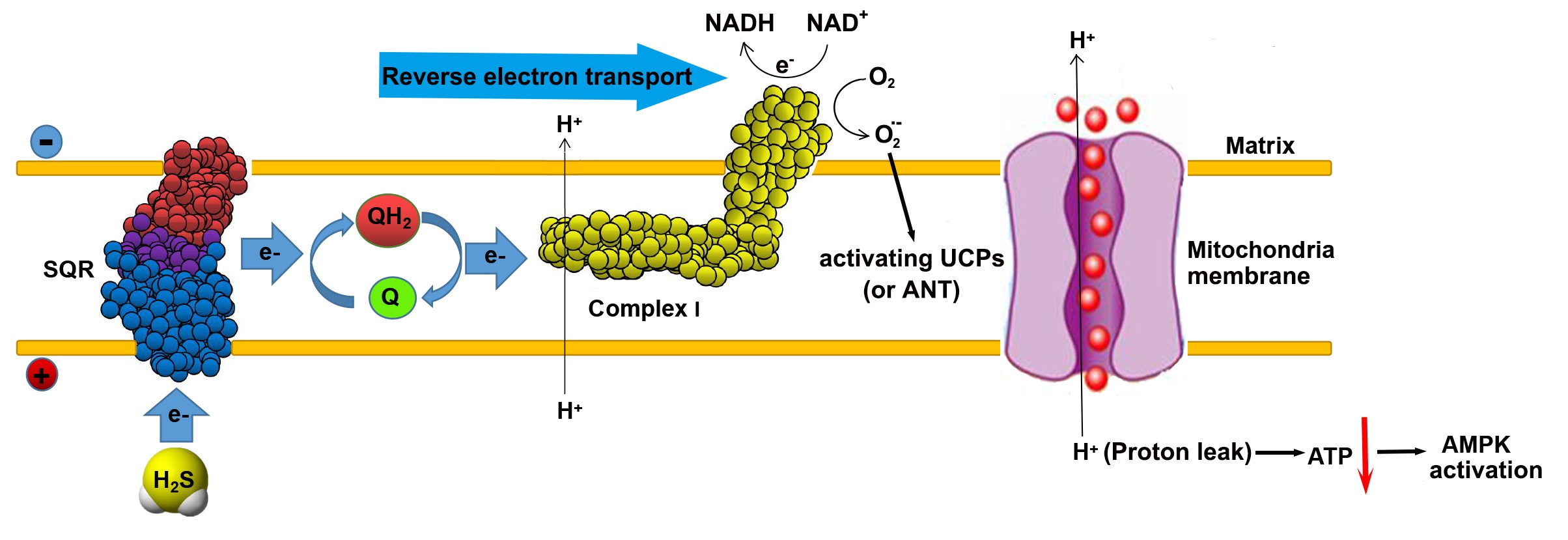 SQR是启动硫化氢氧化代谢第一步的关键酶,其功能是将硫化氢氧化为过硫化物。由于SQR启动了硫化氢的不可逆氧化代谢,所以长期以来SQR一直被认为抑制硫化氢信号传导。经过5年多的合作研究,程坚和贾佳课题组意外发现:SQR是介导内源性和缓释硫化氢胞内信号传导的关键酶。内源和缓释供体释放的硫化氢被SQR氧化后驱动电子在线粒体复合物I水平的反向传递,从而导致线粒体氧自由基的产生。线粒体氧自由基进而通过激活解偶联蛋白导致硫化氢的胞内信号传导,如下游AMPK的激活。特别值得指出的是:内源性硫化氢和特定缓释硫化氢供体仅特异性地通过SQR启动胞内信号传导,而不抑制线粒体复合物IV。该研究还首次制备了SQR条件性敲除小鼠,并利用脑出血模型表明SQR是硫化氢发挥药理作用的特异性分子开关。