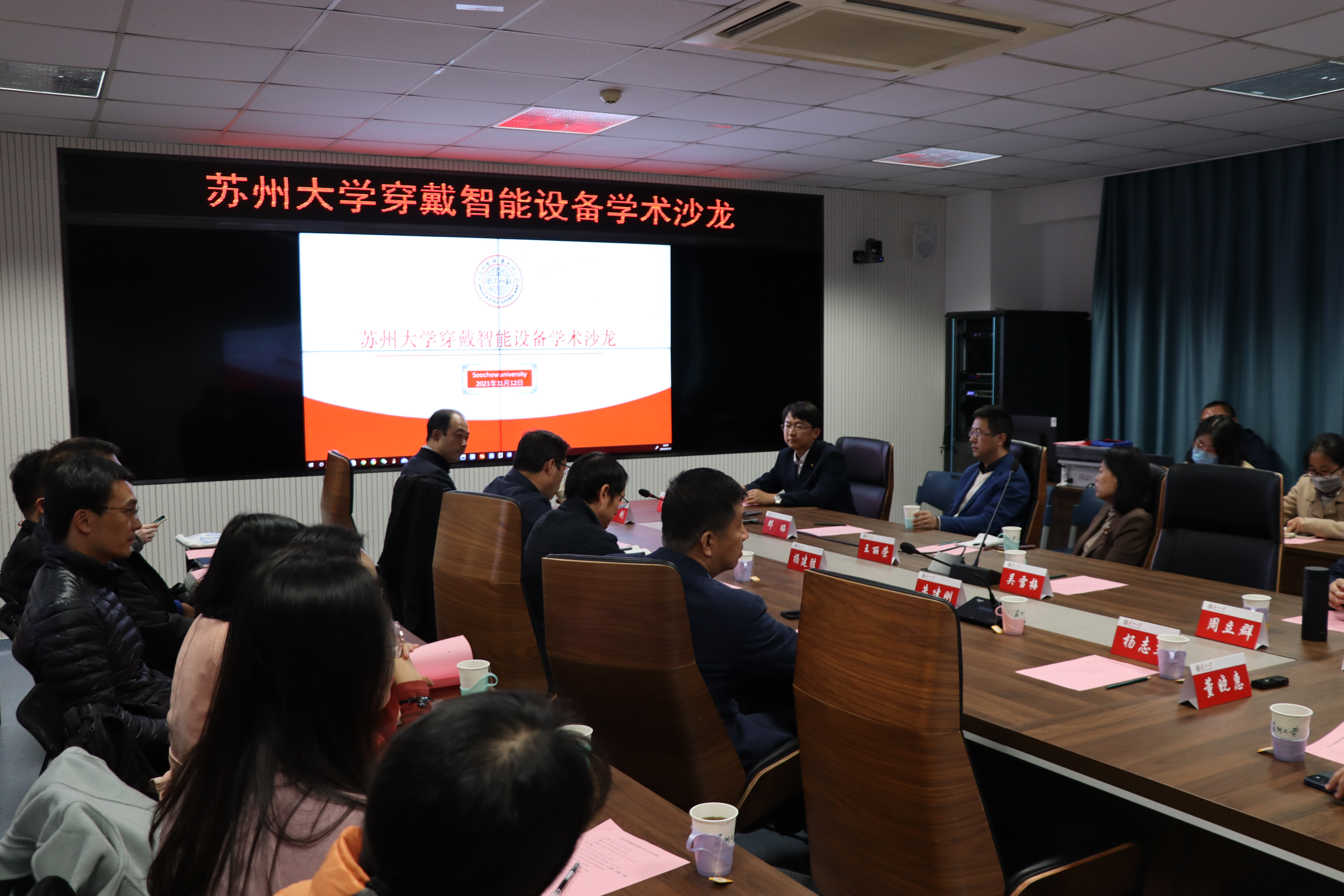 仇国阳介绍了举办本次活动的初衷和意义,希望各位老师和企业家能通过本次活动,加强沟通交流,增进彼此了解,促进学科交叉、相互合作、共同成长。交流会上,机电工程学院副院长陈涛教授、纳米科学技术学院副院长揭建胜教授、电子信息学院王丽荣教授、光电科学与工程学院胡志军教授、纺织与服装工程学院方剑教授、能源学院邓昭教授等六位专家围绕穿戴智能设备相关研究进展和发展趋势作了主题分享。土猫(苏州)智能科技有限公司总经理周立群、苏州起重机械二厂总经理杨志杰分别介绍了各自企业发展情况,以及在穿戴智能设备研发方面的进展,希望依托苏州大学多学科背景和创新资源优势,开展更多创新合作,实现共赢。