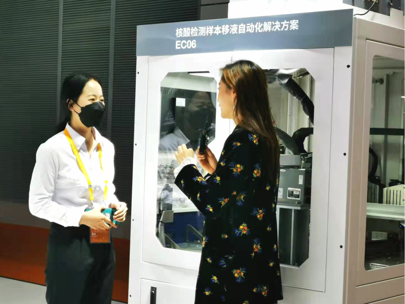 11月5日,机电工程学院孙立宁教授团队与上海蓝沙生物科技有限公司联合研发的新冠核酸检测样本移液自动化设备,在上海举办的第四届中国国际进口博览会现场首次展出。该设备采用垂直六关节机器人替代人工全自动完成核酸检测样本移液操作,进一步提升核酸检测效率和准确度,极大减少病原体暴露风险,此次“首秀”便引发科技日报、凤凰网、东方网等多家媒体报道,吸引了各界的广泛关注。