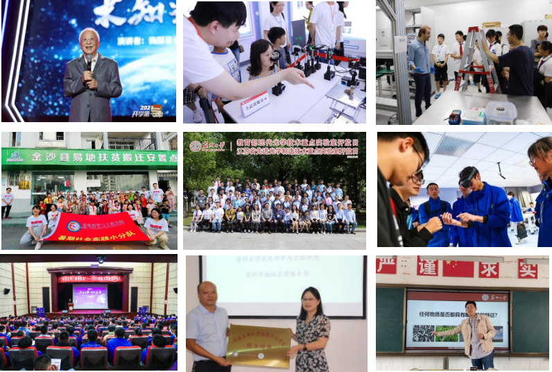 近年来,光电科学与工程学院坚持以践行社会主义核心价值观、弘扬科学精神为主线,依托“追光铸魂”科普教育中心组织开展各类主题教育活动50余场次。坚持立德树人,围绕“传承科学家精神 勇担新时代使命”开展系列活动,潘君骅院士亲身宣讲,畅谈科学人生,培育青年师生使命担当,形成科研力量投身科学普及的思想自觉和行为自觉;广大光电学子积极响应潘院士“起而行之 强国有你”的号召,在微党课、主题宣讲、专题读书会等党团活动中传承科学家精神,践行爱国奋斗的赤子之心。强化社会科普责任,开放科研平台,向社会公众特别是青少年开展科学知识普及活动,传播科学知识,讲好科学家故事。期间,潘君骅院士及学院数位一线科研学者多次走进苏州市中小学校园,开设讲座,并开展光学科普课堂;苏州市陆慕高级中学等数家学校走进“追光铸魂”科普教育中心及校外科技公司实践基地,近距离参观体验科技前沿产品,探索科学家精神故事;学院与相城区渭塘中学等多所学校签订创新教育和人才培养计划,助力初中高中大学贯通式教育发展,为探索人才培养新模式搭建平台和桥梁;学院“科学背包”实践团连续多年赴江西、贵州等地开展支教活动,结合当地实际情况精心设计科普课程,提升当地青少年的科学素养,助力乡村振兴。相关活动先后得到了国家、省、市各级媒体的报道。