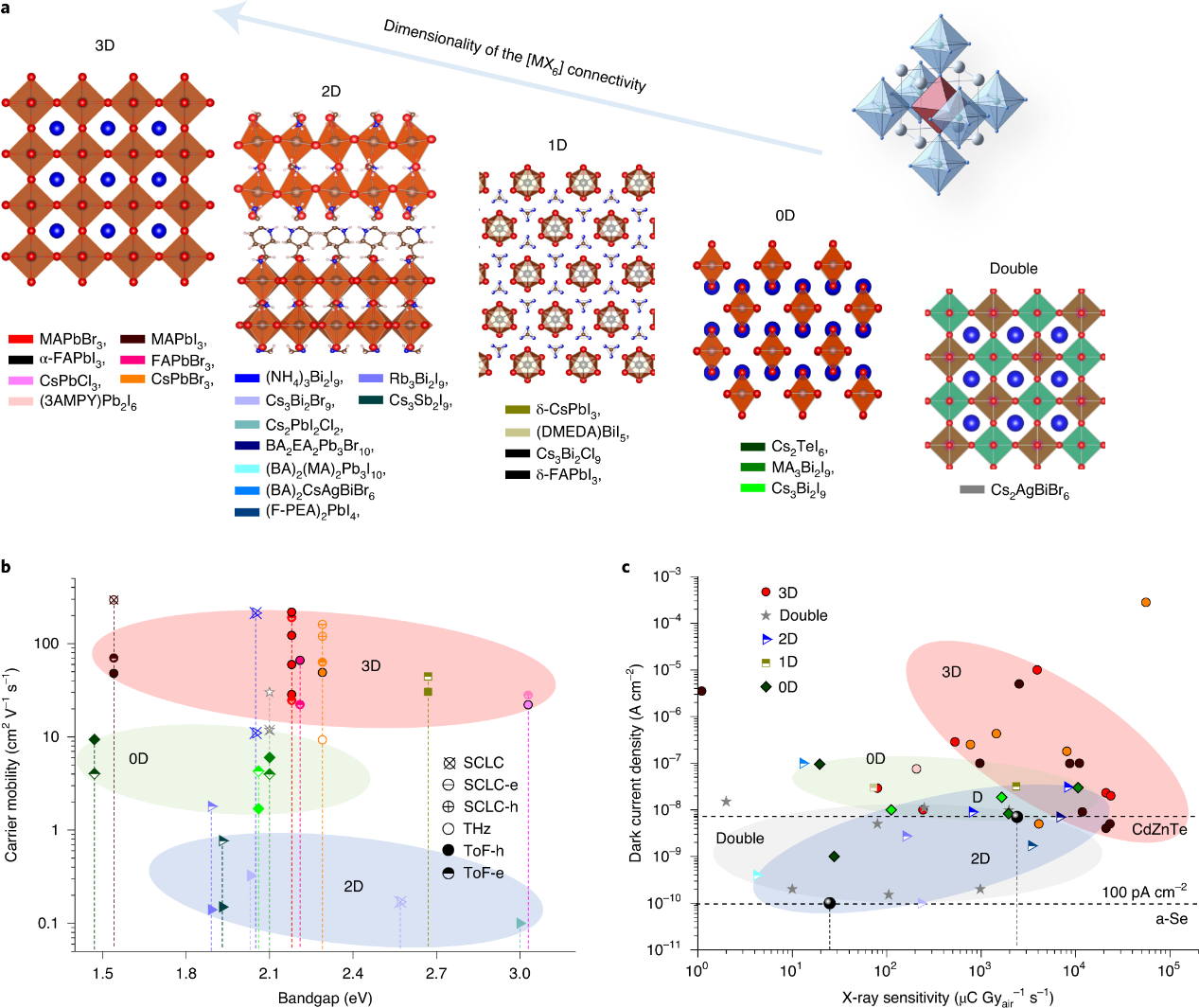 该综述着眼于材料应用需求,从两种辐射探测模式(光电流模式和单光子模式)出发,介绍了相应的半导体器件发展,并提出获得可靠测量指标的基本方法。作者从有效原子质量、载流子特性、单晶参数、禁带宽度、电阻率、缺陷浓度等多个维度将MHPs与传统材料进行比较,总结并讨论了几十种钙钛矿材料的结构维度及本征性质和射线响应性能的影响规律。