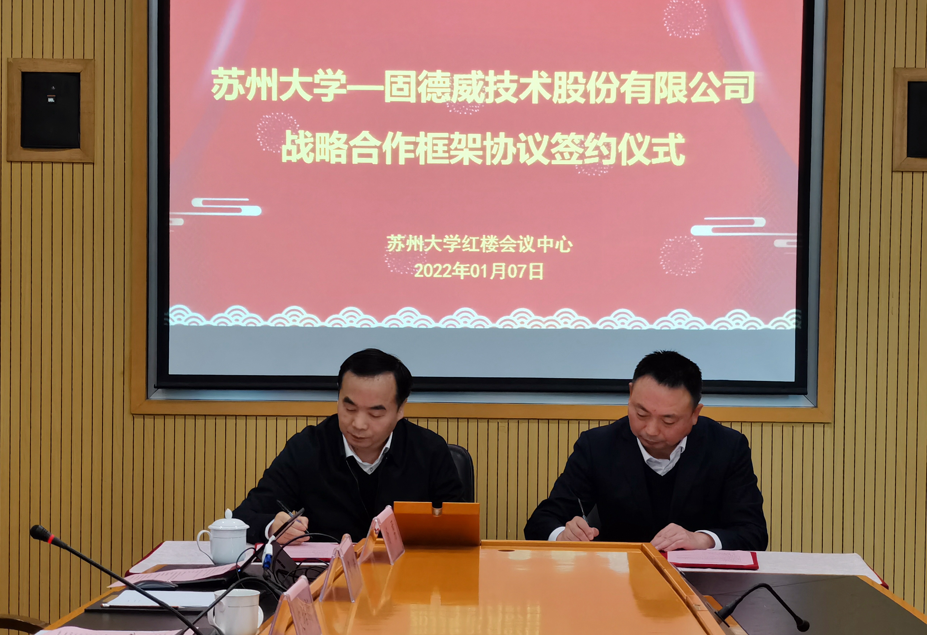 1月7日,苏州大学与固德威技术股份有限公司(以下简称“固德威”)战略合作框架协议签约仪式在红楼会议中心举行。固德威董事长黄敏、副总裁方刚、研发中心总监向军,我校党委常委、副校长张晓宏,江苏苏大投资有限公司董事长仇国阳,轨道交通学院党委书记戴佩良、院长史培新、副院长黄伟国,苏州大学—固德威清洁电力协同创新中心主任杨勇、副主任樊明迪等参加了签约仪式。仪式由史培新主持。