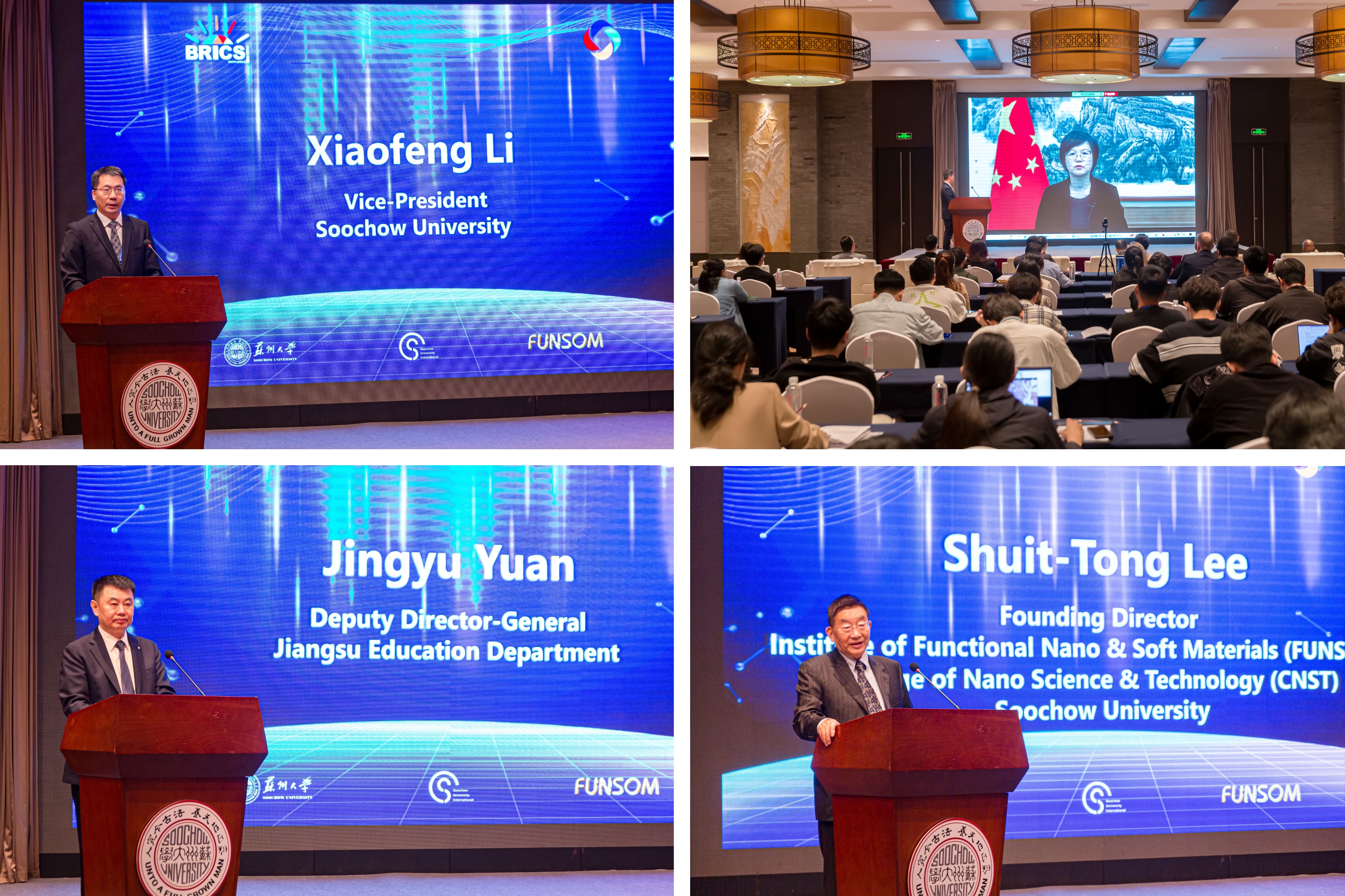 11月1日至3日,在科技部国际合作司和省教育厅的指导和关心下,由我校功能纳米与软物质研究院(以下简称FUNSOM研究院)、国际合作交流处主办的“金砖国家材料科学与纳米技术工作组第五次会议暨江苏能源与材料国际产学研合作论坛”在苏举行。 中国科学院院士、FUNSOM研究院院长李述汤,科技部国际合作司一级巡视员王蓉芳,省教育厅副厅长、党组成员、省委教育工委委员袁靖宇,高校科技发展中心主任高建新,对外合作与交流处副处长汝益仙,我校党委常委、副校长李孝峰出席会议。来自金砖国家科技主管部门、科研院所、高校、高新技术企业代表,FUNSOM研究院相关专家学者及我校师生共百余人参加会议。开幕式由我校国际合作交流处处长、FUNSOM研究院副院长何乐主持。 开幕式上,中方代表李孝峰、王蓉芳、袁靖宇、李述汤分别致辞,对远道而来的各国代表和嘉宾表示了热烈欢迎。他们表示,金砖各国积极拓展合作领域,充实合作内涵,在科技、经济、金融、文化等方面有着紧密的合作关系,为推动世界发展贡献了“金砖智慧”。此次会议提供了互相学习交流的机会,期待金砖国家延续良好的合作势头,深入推进国际产学研用创新发展机制,推动高质量科技成果转移转化。
