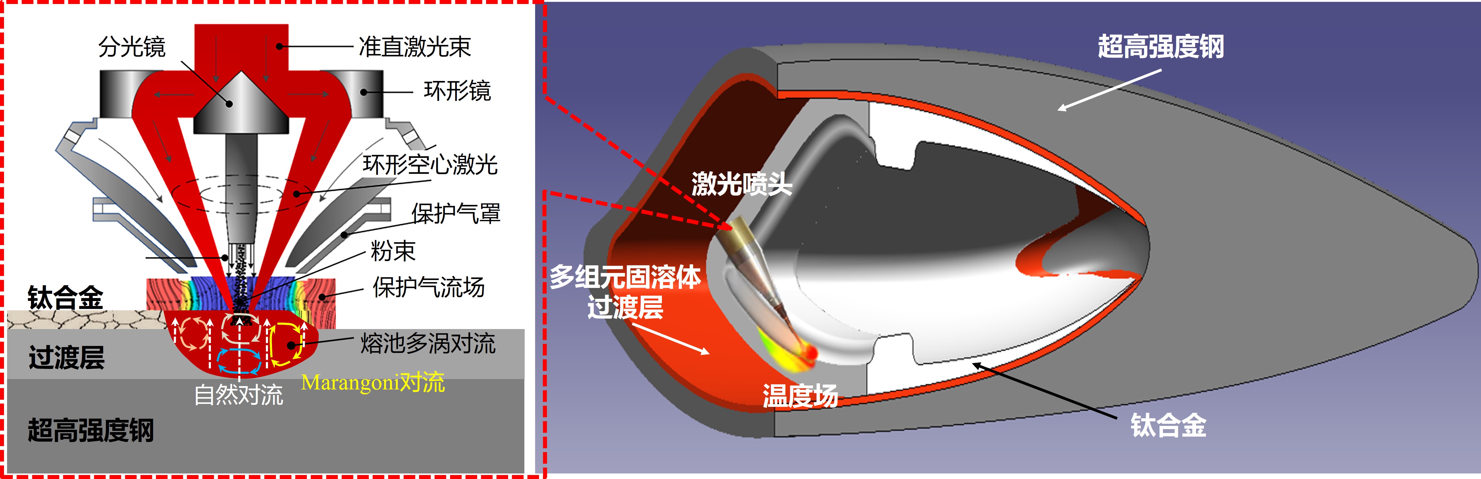 针对高超声速系统钛/钢异质壳体开裂及成形困难问题,夏志新教授团队提出了全新的钛/钢异质界面多组元固溶体过渡层设计思想,将界面结合强度提升到与钛合金基体相当的800MPa级水平,建立大尺寸钛/钢异质壳体高精度成形与材料成分-工艺参数-组织性能-应力变形的协同控形控性方法,突破常规连接手段的限制,完善钛/钢异质壳体高效高性能制造的理论基础和应用薄弱环节,切实为钛/铝、钢/铝、铜/钢等异质金属材料体系增材与焊接提供全套技术解决方案,服务航空航天等国家重大战略需求。