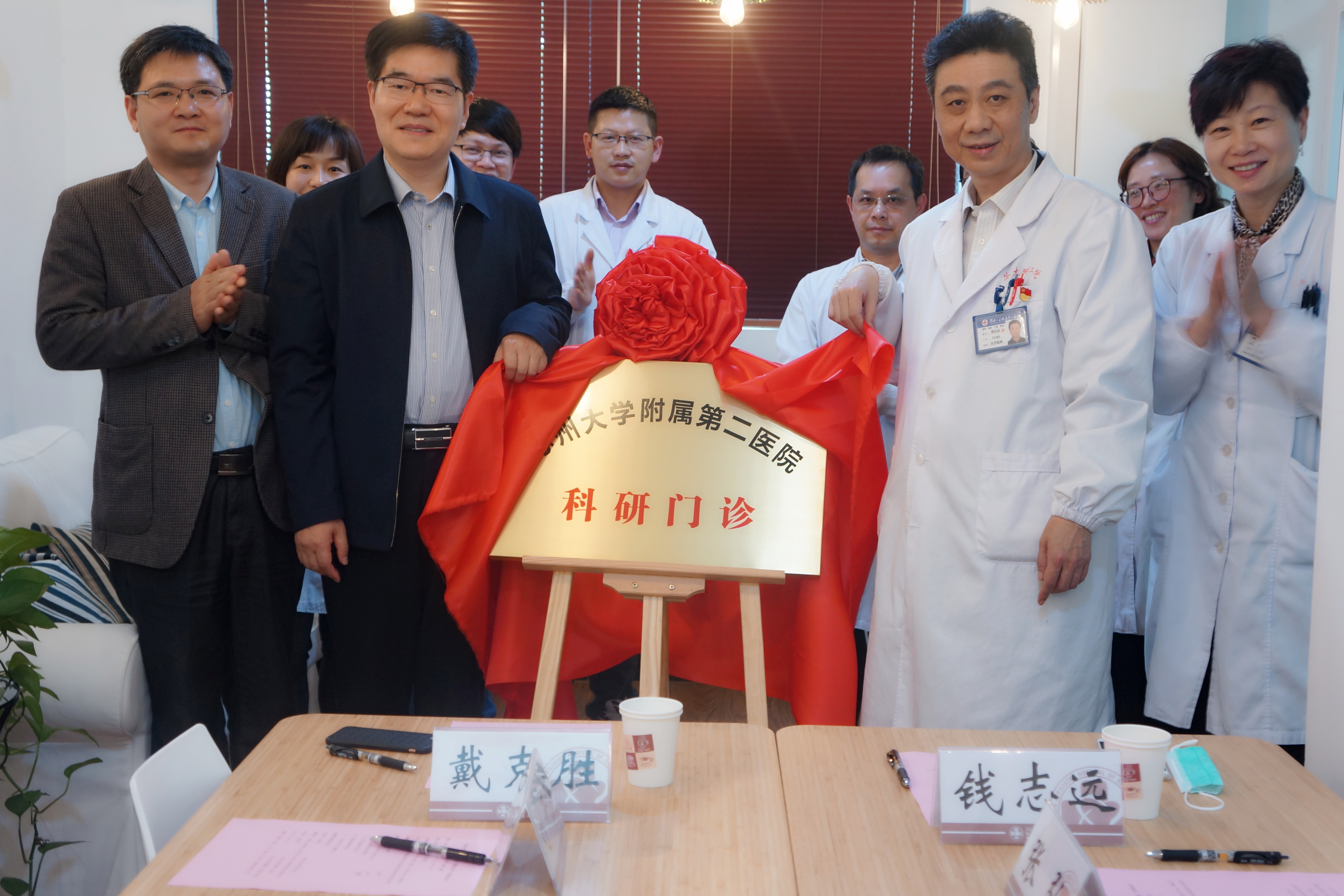 4月28日下午,苏州大学附属第二医院“科研门诊”正式揭牌。苏州大学科学技术研究部科学技术处副处长刘开强、苏州大学唐仲英医学研究院副院长戴克胜、苏州大学附属第二医院副院长钱志远,以及医院相关科室主任及科研人员出席开诊仪式。揭牌仪式由医院科研处处长张弘主持。