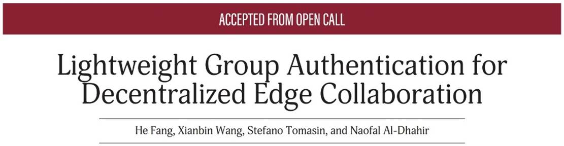 在“Lightweight Group Authentication for Decentralized Edge Collaboration”(DOI: 10.1109/MCOM.004.2200264)一文中,团队考虑6G通信具有多方交互愈发频繁和协作愈发紧密的发展趋势,对分布式边缘协作的高安全性和低时延的应用需求带来极大挑战,提出了一种基于协作过程的轻量级多设备认证方案,同一协作群体的边缘设备可利用上一轮协作过程中的分布式学习信息进行新一轮的身份认证。该方案相对于传统的多设备认证方案具有低时延、低开销及安全性能高等优势。