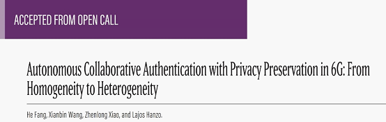 研究成果“Autonomous Collaborative Authentication with Privacy Preservation in 6G: From Homogeneity to Heterogeneity”(DOI: 10.1109/MNET.002.2100312)针对复杂异构网络架构中安全可靠、隐私保护和高灵活性的应用需求,提出了一种基于联邦学习的自动化协作认证方案。该方案基于态势感知的本地协作策略,结合智能合约进行监督,协同多个边缘设备共享本地信息并更新认证模型进行身份认证,具有隐私保护、高安全性、高效认证和稳定可靠等优势。