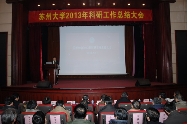 路建美作苏州大学2013年度科技产业工作总结汇报。她总结了2013年度科技产业工作取得的五大突破:我校牵头的苏州纳米科技协同创新中心进入首批国家“2011计划”;国家自然科学基金首次突破300项大关,达311项;获国家科技进步二等奖2项,各级各类科技奖108项;SCI论文发表1632篇,三大检索论文2217篇;专利申请突破1000项,达1027项。她指出,2013年度我校在提升科技创新能力、深化政产学研合作及创新科技管理体制等方面取得了显著的成绩。同时她对2013年度科技产业工作先进单位和杰出个人进行了表彰。路建美分析了科技产业工作中存在的不足,并部署了2014年度的重点工作:聚集一个目标、形成六个重点、构建一个模式、注重两个效益。她强调,2014年我校将围绕建设高水平研究型大学这一目标,加强国家级重点重大项目的设计与策划、加强各类高水平人才及团队的建设、加强科技平台的构建、加强政产学研合作、加强科技管理与服务、加强协同创新,构建“机制—项目—团队—平台—成果—效益”的良性发展模式,注重与国内一流大学横向比较科技竞争能力显著提高的效益,注重在区域经济社会发展中服务能力和水平显著提高的效益。