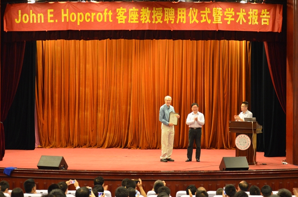 近日,图灵奖得主、康奈尔大学计算机系教授John E. Hopcroft博士受聘为我校客座教授,将为推动学校、特别是计算机科学与技术学院培养优秀创新团队、强化学科创新能力及增进国际合作交流等方面起到了积极作用。5月29日,受聘仪式在本部敬贤堂举行,计算机科学与技术学院副院长张民教授主持仪式。