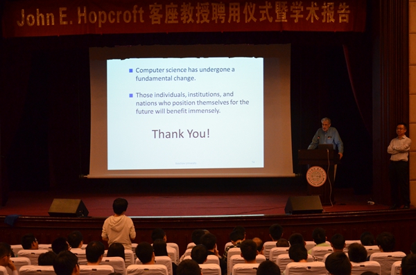 聘用仪式结束后,Hopcroft博士还为现场的数百名师生带来了“The Future Role of Computer Science”为主题的学术报告。Hopcroft博士以计算机科学的发展史为切入点,总结领域内曾经的编程语言、操作系统等,强调了计算机科学的“变化性”。随后他通过大数据、社交网络等热门并且发展迅速的技术,统筹介绍了信息科学的发展方向。“社交网络的快速发展、计算和交流的结合、数据规模的增大都需要新科学基础来支持对信息的接入。”