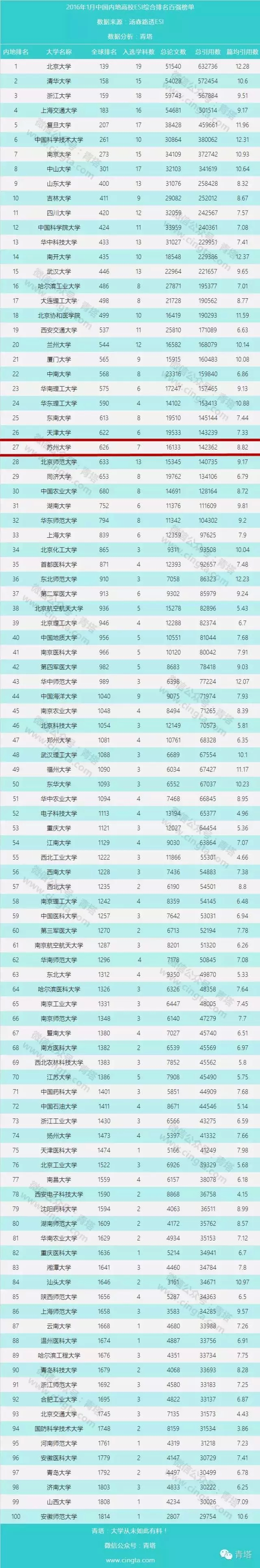 而一流大学和一流学科如何评价,ESI评价指标是个极其重要的参考依据。目前全球各大知名大学都普遍采用ESI来衡量和评价学科实力,中国的各级教育主管部门和大学最近几年来也开始越来越重视ESI指标,越来越多的大学把进入ESI全球1%的学科数量定为发展目标之一,重要性已经和教育部的学科评估不相上下了。本期青塔小编整理了2016年1月ESI中国内地TOP100高校的综合排名,同时整理了各校入选学科数情况,结果供大家参考。