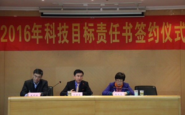 熊思东与12个自然科学类学院(部)负责人签订了2016年科技目标责任书。路建美与科学技术与产业部下设各处处长签订了2016年科技管理部门目标责任书。