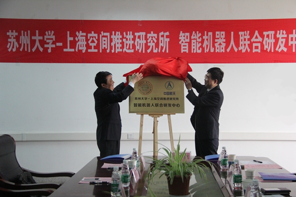 6月2日上午,苏州大学—上海空间推进研究所“智能机器人技术联合研发中心”签约揭牌仪式在我校机器人与微系统研究中心隆重举行。校党委书记王卓君与航天推进技术研究院书记黄亮出席了签约仪式,并为联合研发中心揭牌。机电工程学院院长、机器人与微系统研究中心主任孙立宁教授与上海航天推进研究所所长张民庆研究员共同签约。仪式由校科学技术研究部朱巧明常务副部长主持。