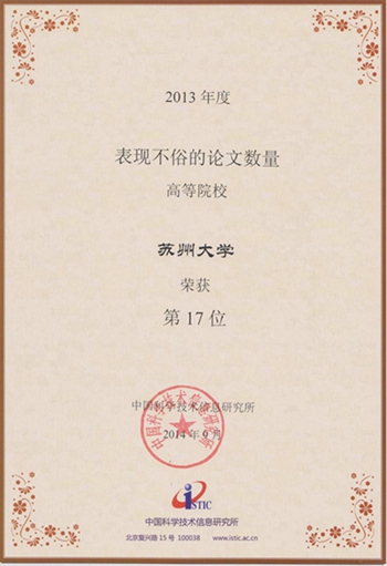 2013年度我校“表现不俗论文”数量为777篇,位居全国高等院校第17名,名列全省高校第2位。“表现不俗论文”数量占本校全部收录论文的比例为46.36%(全国平均比例为33.8%),在全国高等院校中名列第一名。“表现不俗论文”即在每个学科领域内,按统计年度的论文被引用次数世界均值划一条线,高于均线的论文,论文发表后的影响力超过其所在学科的一般水平。自2009年中国科学技术信息研究所第一次公布通过这一指标进行的统计结果以来,受到国内外学术界的普遍关注。