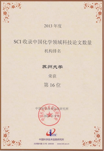 2013年度我校SCI收录中国化学、材料科学领域科技论文数量机构排名分别为第16位和第20位。在SCIE收录论文数量、SCI学科影响因子前1/10的期刊论文、即年被引用论文数量等统计指标中,我校2013年度较2012年度均有明显提升。(见附表)